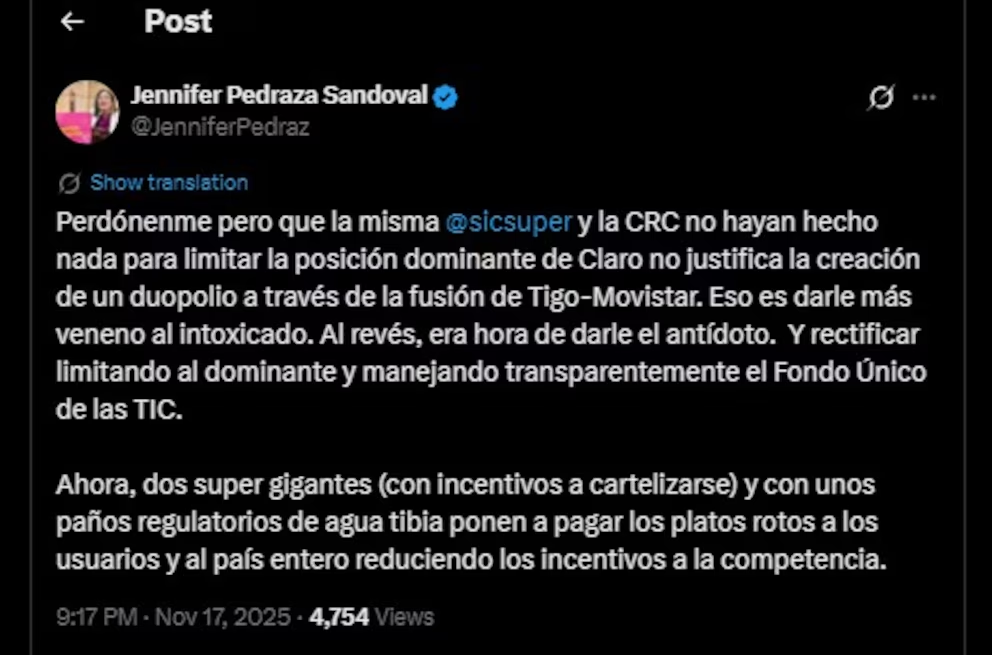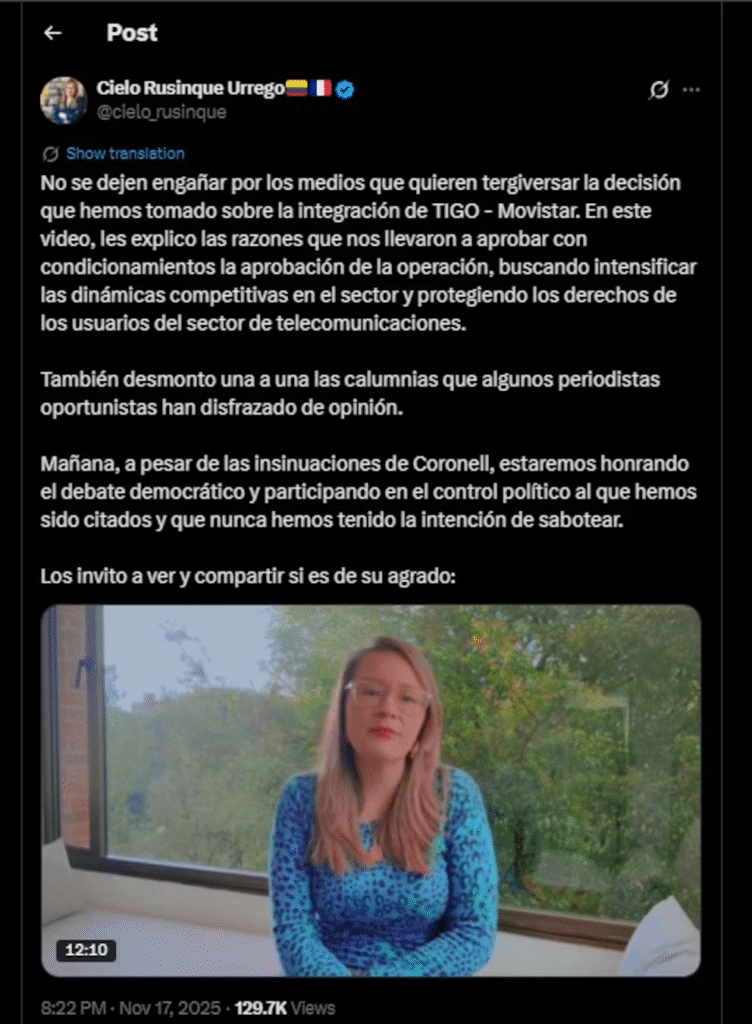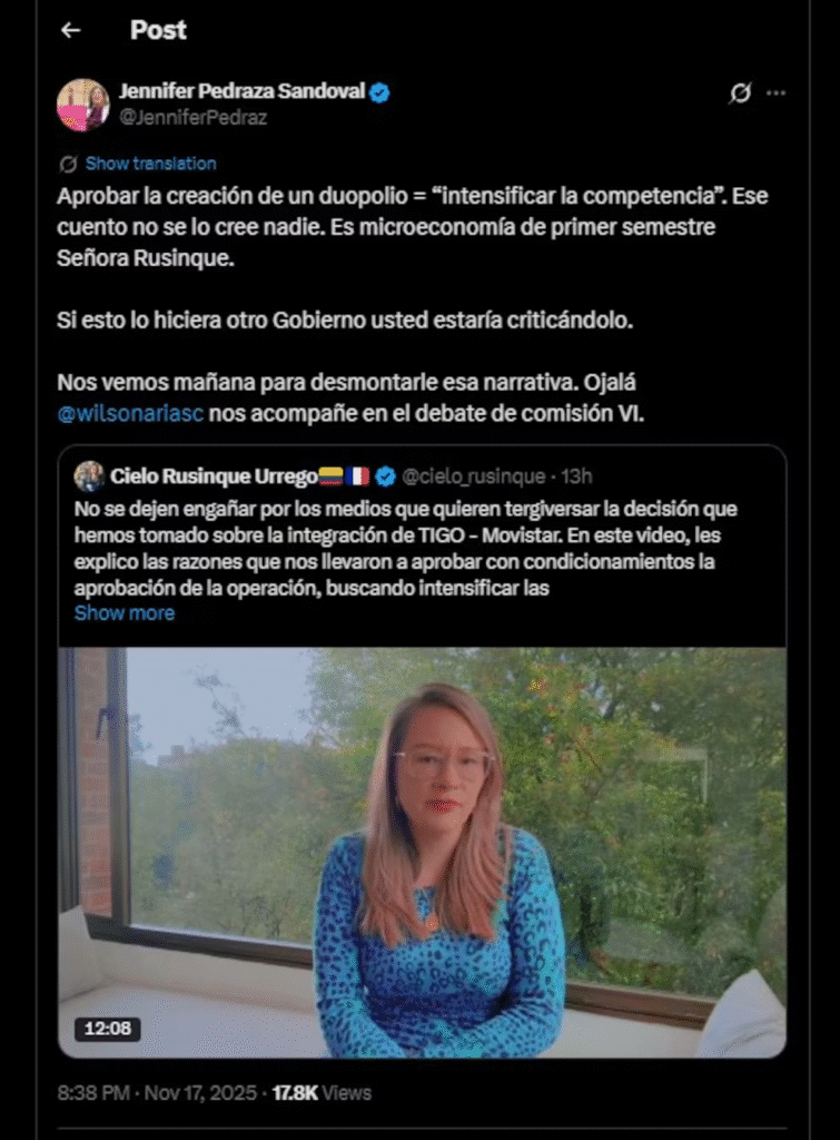 La respuesta de la representante surgió a raíz de una publicación de Cielo Rusinque, superintendente de Industria y Comercio, quien defendió la decisión sobre la integración de Tigo y Movistar. Rusinque señaló que algunos medios estaban distorsionando la información y sostuvo que la medida busca fortalecer la competencia y proteger a los usuarios.